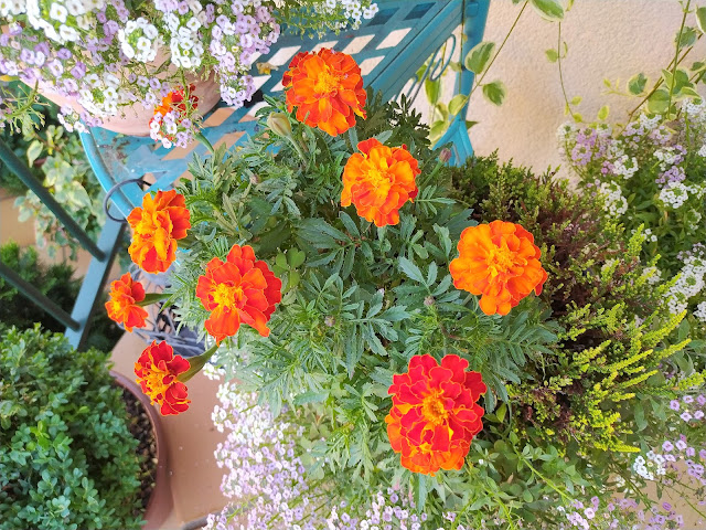 Los claveles chinos dan altura a la composición y el aliso cubre la parte de baja de la maceta. El color de la calluna así como su textura contrastan con el del aliso y los tagetes.